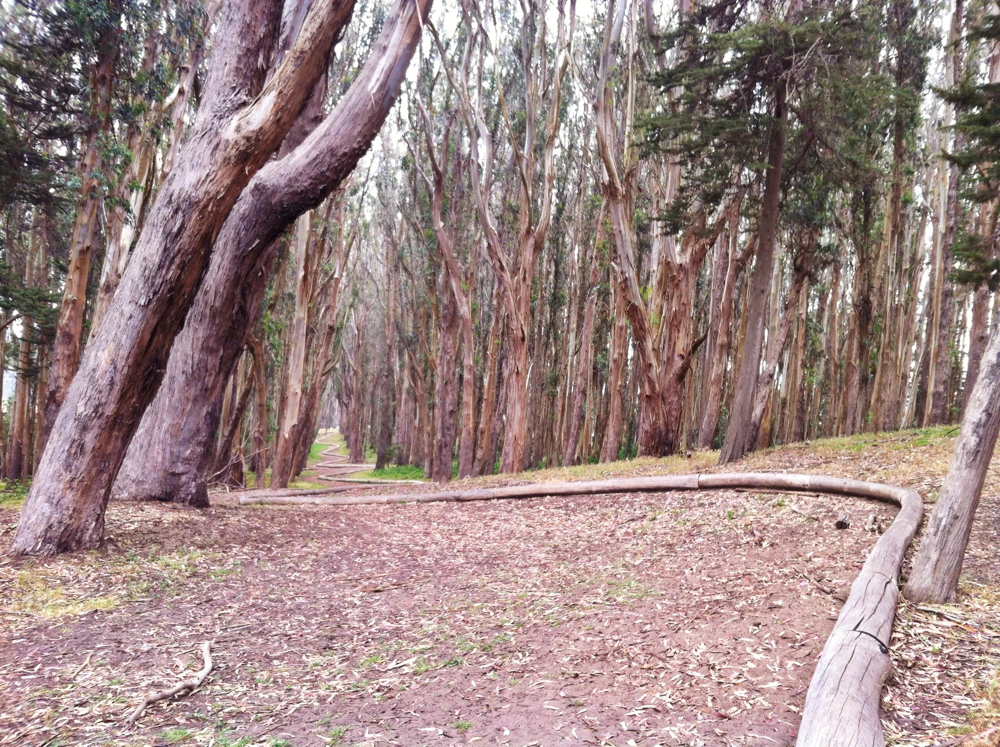 We recently found out about Andy Goldsworthy's Woodline installation in the southeast corner of the Presidio by the Arguello Gate, just east of Lovers Lane. The artist used reclaimed trees to make a long meandering serpentine structure that winds its way down the hill for about 2/3rds the distance of lovers lane. It's set amongst a forest of eucalyptus trees bathing your hike in a wonderful diffused light, great for photos.