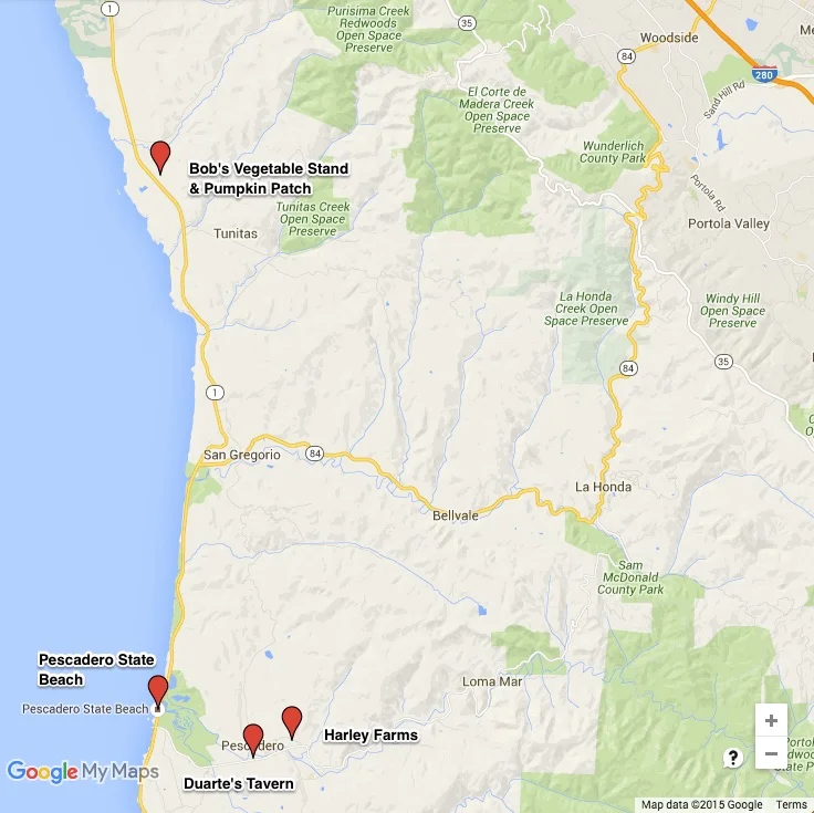 This week’s adventure is down the coast a bit. The Half Moon Bay Pumpkin festival gets a lot of press, and it’s a wonderful event, but getting there can be a nightmare. We like to head a bit further south towards Pescadero (which means the place to fish in Spanish), make a stop at Bob’s pumpkin patch for great pumpkins at affordable prices and their spectacular view, then stop in at Harley Farms to see the goats, and Duarte’s to grab a little bite to eat. Pescadero State Beach is also right here and if the weather is suitable, quite a nice spot to dip your toes in the water.