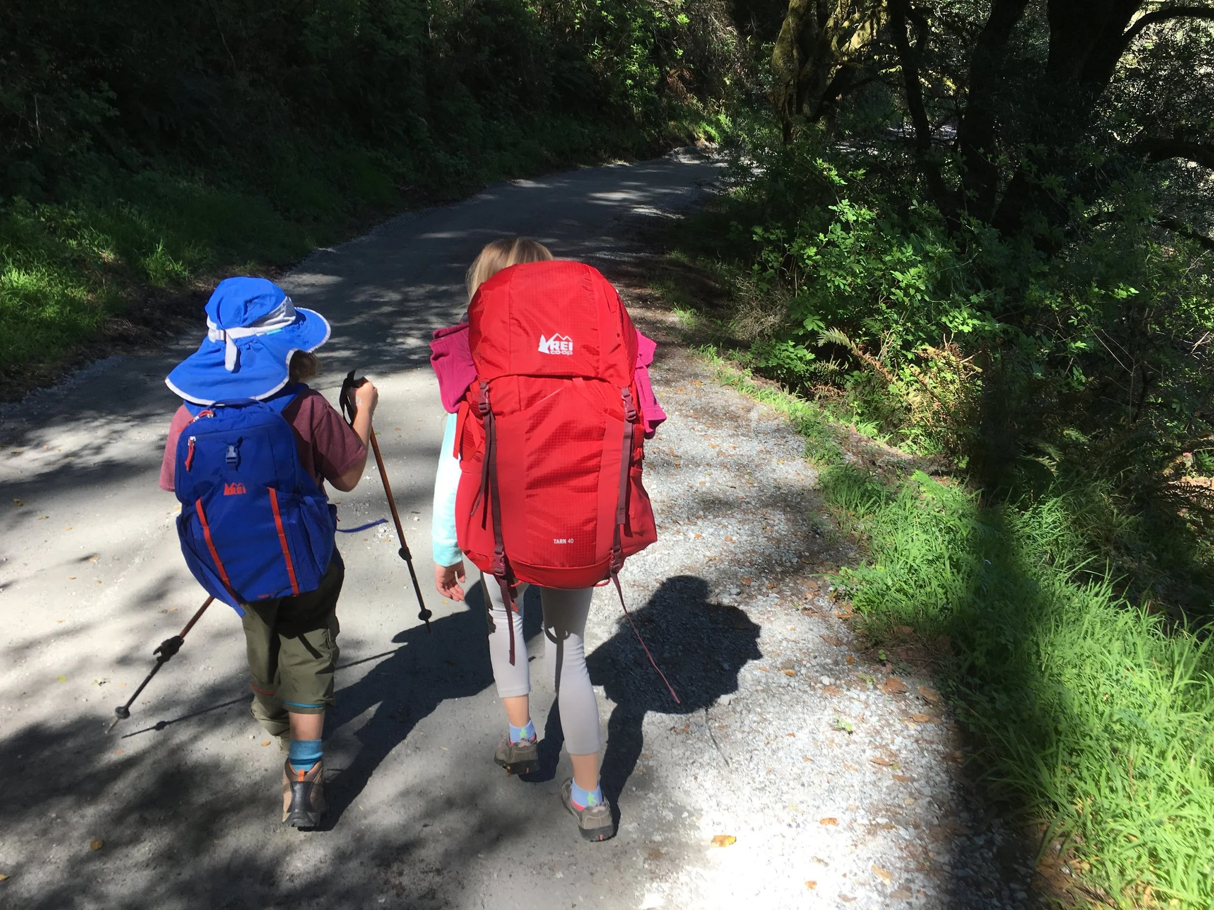 Once we put on our packs, the hike itself took about an hour. All of us wore backpacks, younger ones wearing a day pack with more personal belongings. My now 9-year-old daughter has managed a small internal frame backpack with her sleeping bag, pad, clothes, and pack pillow since last year.